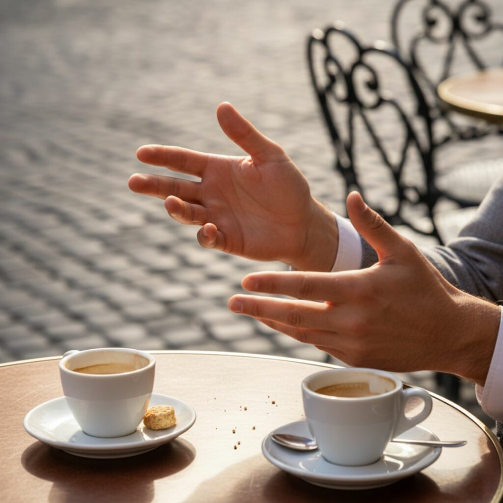 El cuerpo italiano tiene gramática propia. Las manos hablan, los ojos responden, el gesto comunica.