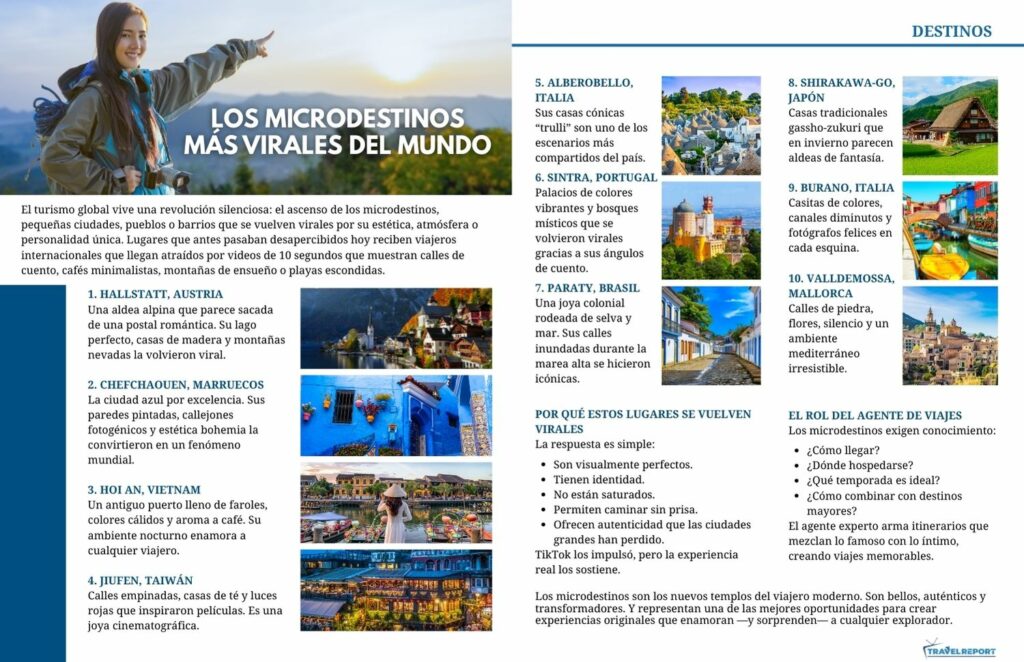 Un microdestino es un pueblo pequeño con identidad fuerte, estética fotogénica, baja saturación, naturaleza cercana y experiencias auténticas.