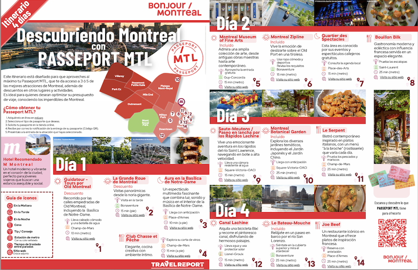 Este itinerario está diseñado para maximizar tu experiencia utilizando el Passeport MTL, que te da acceso a las mejores atracciones de Montreal (3 o 5), además de descuentos en otros lugares. Ideal para quienes desean descubrir lo mejor de la ciudad de manera conveniente y económica.