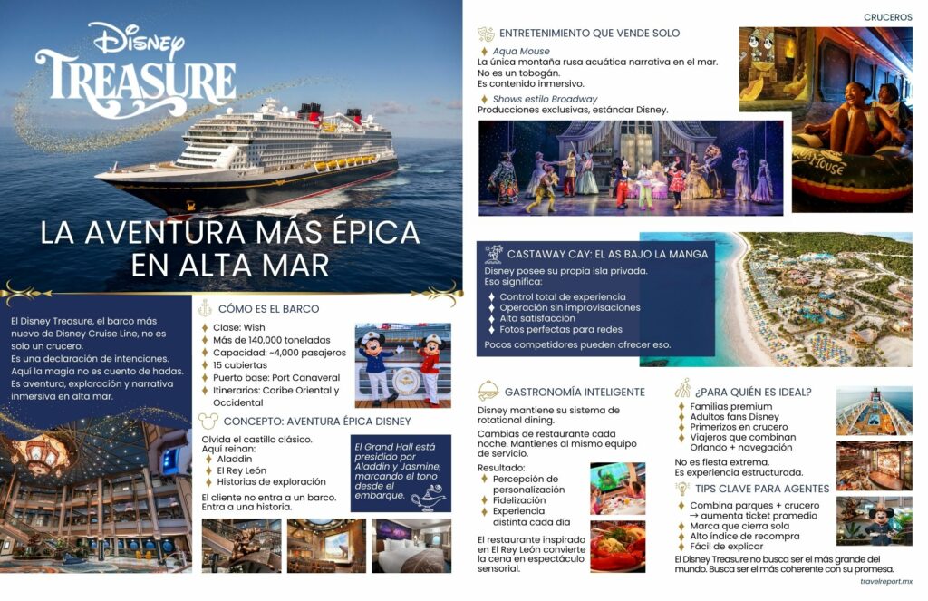 El Disney Treasure representa la evolución estratégica más clara dentro de la flota de Disney Cruise Line. Perteneciente a la clase Wish, este barco no busca únicamente impresionar por tamaño, sino consolidar una propuesta coherente basada en narrativa inmersiva, control operativo y fidelización del cliente.
