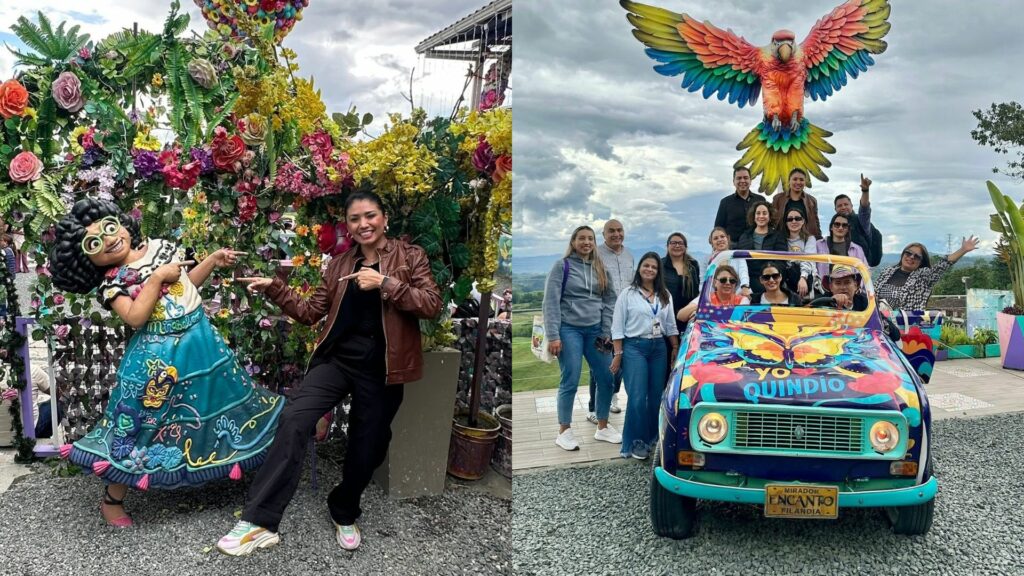 La primera parada fue una deliciosa comida de bienvenida en el restaurante Mirum con una propuesta gastronómica deliciosa y que impacta con unas vistas espectaculares, después con las pilas recargada fuimos al Mirador de Encanto, un espacio natural donde encuentras panorámicas de la belleza de las montañas de Colombia y muchísimos spots instagrameables de la película “Encanto” ya que Colombia fue el país inspiración para realizar esta película, sin duda esta este mirador es considerado la atracción más divertida de Filandia. También recorrimos la Calle del Tiempo Detenido, un pasaje lleno de colores y arquitectura tradicional, la Plaza Simón Bolivar, calles vibrantes y tiendas que invitan a llevarte un pedacito del Quindío a casa, principalmente de su icónico y aromático Café.