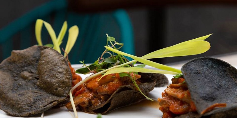 En sus entradas, también destaca el atropellado de machaca en salsa de jitomate rostizado, chapulines y chile morita.