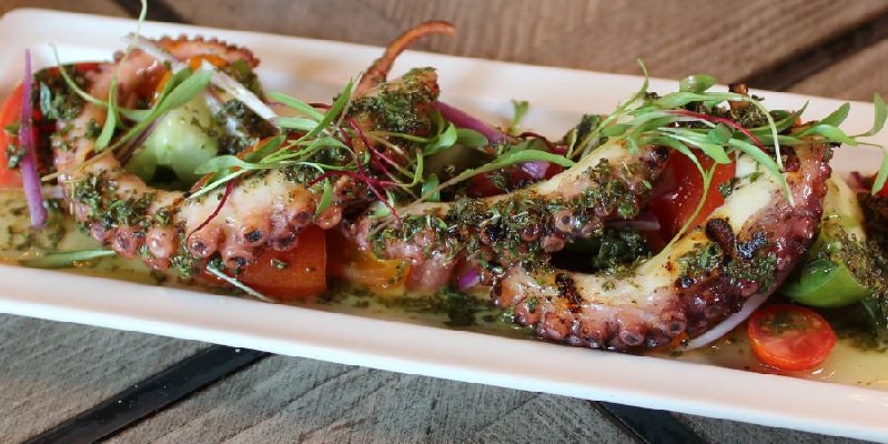 Los amantes de los frutos del mar no pueden dejar de probar el pulpo a la griega servido con jitomate, cebolla morada y vinagreta de orégano. El maridaje perfecto, un vino blanco chardonnay.