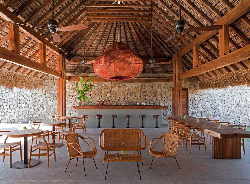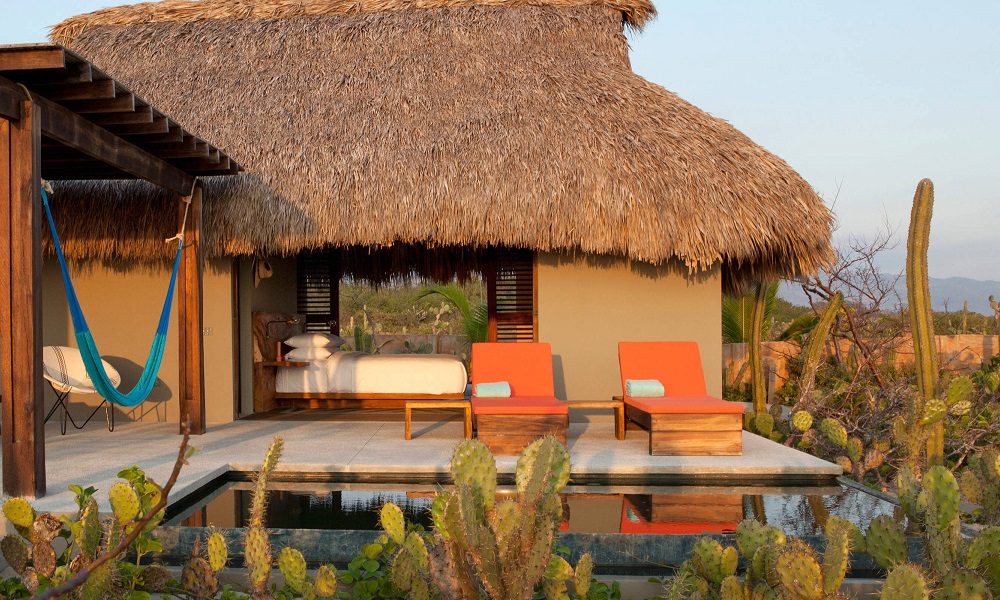 Las suites son las típicas palapas de un destino de playa con techos de palma. Solo que tienen muebles de madera, artesanías oaxaqueñas, zona exterior de chill out, hamaca, dos coloridos camastros y una alberca individual.