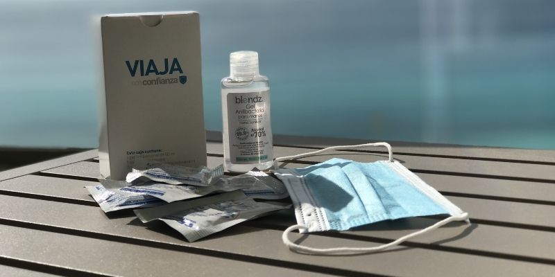 Al finalizar el check in, recibirás un kit de confianza que incluye un gel antibacterial con 70% alcohol que elimina 99.9% de los virus y bacterias, un cubrebocas de tres capas hipoalergénico y un paquete de toallitas desinfectantes.