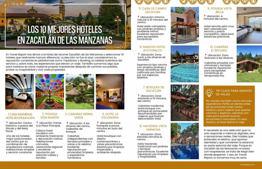 En Travel Report nos dimos a la tarea de recorrer Zacatlán de las Manzanas y seleccionar 10 hoteles que realmente marcan diferencia. La elección no fue al azar: consideramos su reputación constante en plataformas como TripAdvisor y Booking, la calidad auténtica del servicio y, sobre todo, las experiencias que elevan un viaje. También sumamos algo clave: nuestras propias impresiones después de caminar sus pasillos, probar su hospitalidad y vivir cada propiedad.