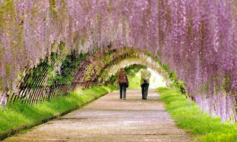 Su composición la integran pétalos de miles de glicinas, plantas catalogadas en el género Wisteria, que bautiza el pasadizo.