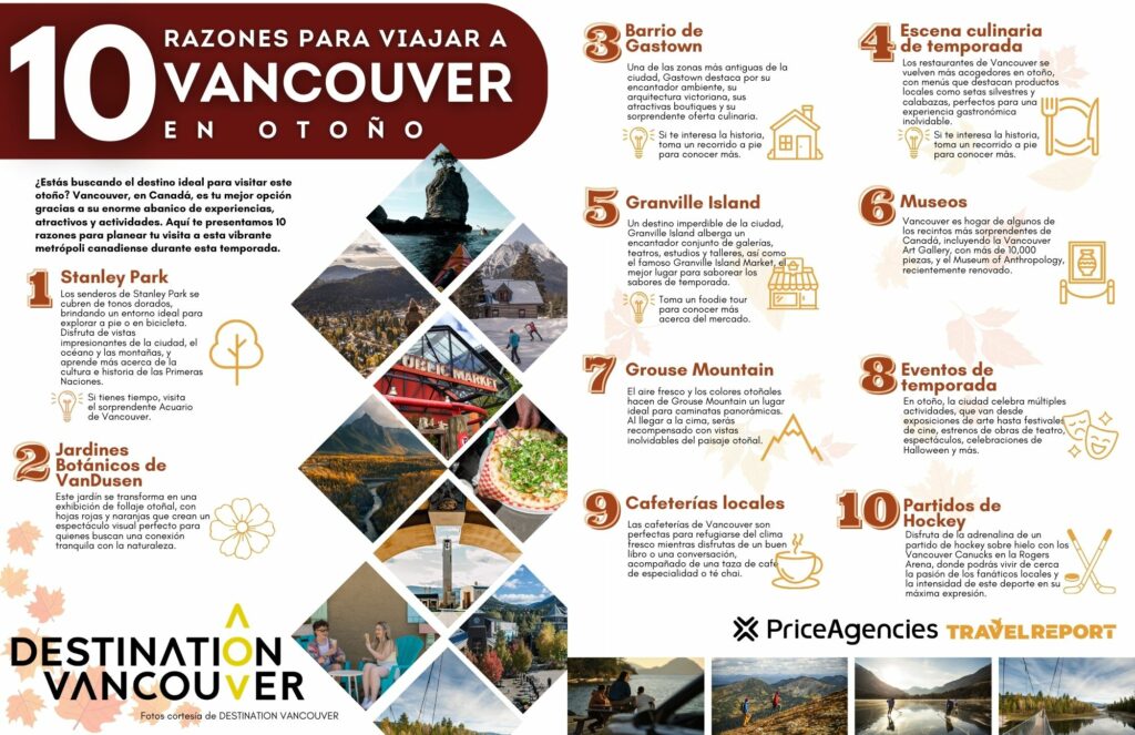Viajar a Vancouver en otoño es una experiencia vibrante y acogedora, ideal para quienes buscan sumergirse en la cultura, naturaleza y gastronomía de la ciudad. ¡Descubre este destino espectacular con Price Agencies y Destination Vancouver, y vive la magia de la estación en cada rincón!