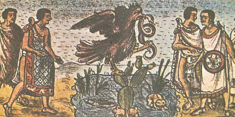 Según la mitología mexica, el dios Huitzilopochtli le ordenó a los habitantes de Aztlán –luego conocidos como -mexicas- dejar atrás esas tierras y buscar un nuevo sitio para fundar su nuevo imperio. Para encontrar el lugar ideal, debían buscar un águila posada sobre un nopal devorando una serpiente.