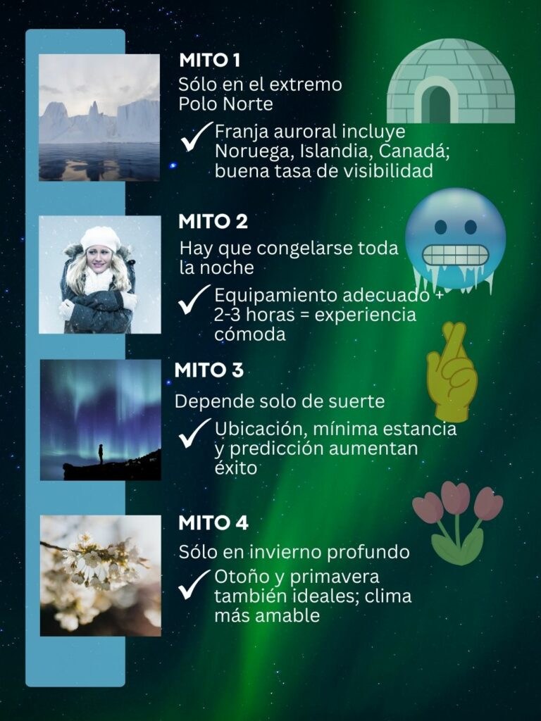Realidad: El espectáculo aparece cuando el cielo está oscuro y despejado, no necesariamente cuando el termómetro marca los valores más bajos. Equipamiento adecuado y sesiones de 2–3 horas suelen bastar.