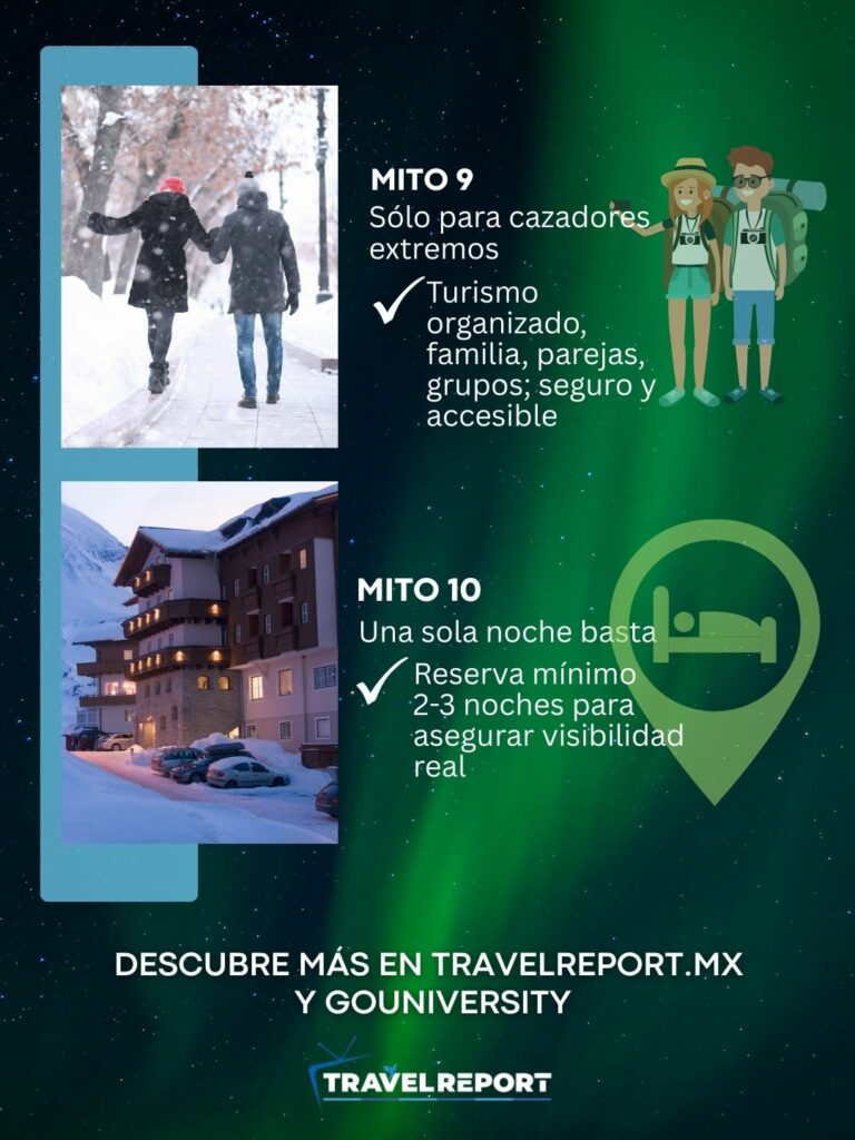 Realidad: Hay factores que puedes controlar: ubicación dentro de la franja auroral, mínimo de noches, evitar contaminación lumínica, consulta de pronóstico geomagnético. Esto convierte la “suerte” en estrategia.
