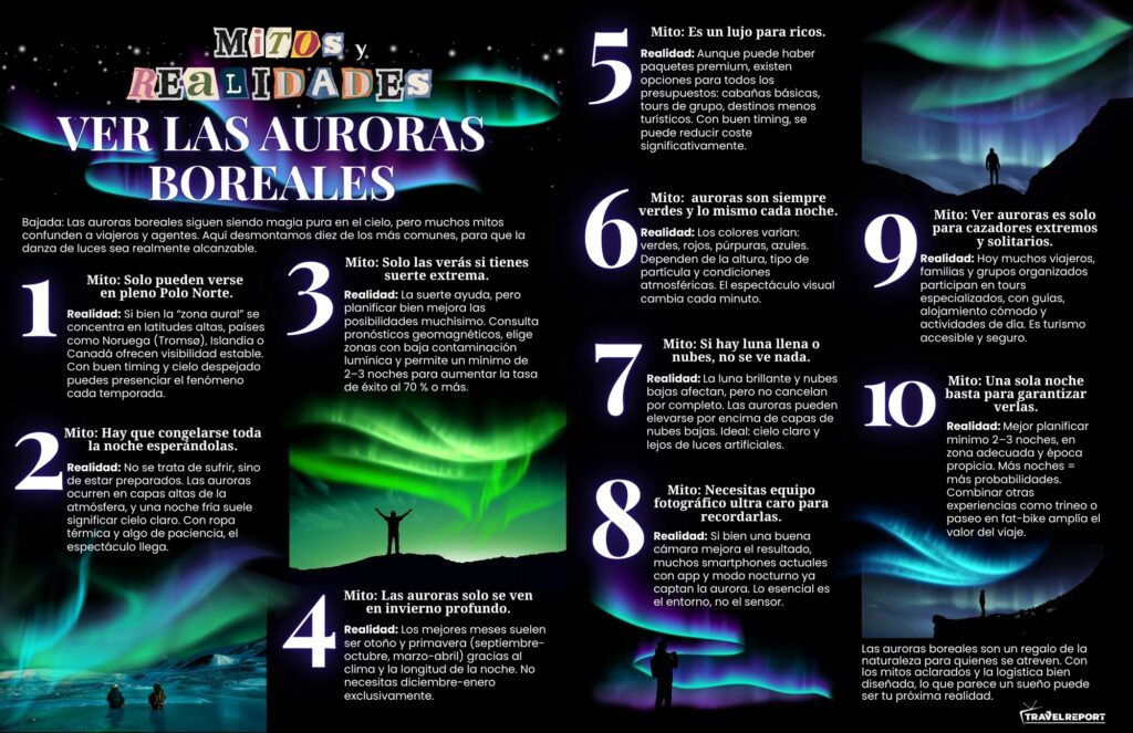 Realidad: El turismo de auroras es cada vez más auténtico: tours familiares, grupos de amigos, parejas, con guías expertos y logística preparada. Es una experiencia para todos.