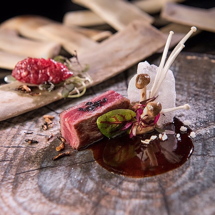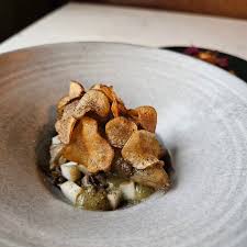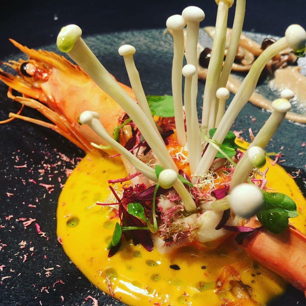 Aquí, los frutos y vegetales son los protagonistas, especialmente en verano, cuando el menú prácticamente elimina las proteínas animales para dar paso a sabores frescos y naturales. Su plato insignia es un homenaje a la sencillez elevada: hongos a la leña coronados con una delicada arlette crujiente y acompañados de un sabayón infusionado con laurel y enebro, creando una combinación aromática inolvidable.