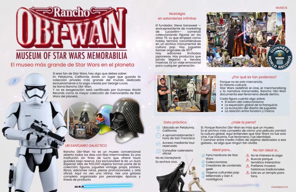 Desde el punto de vista SEO, Rancho Obi-Wan representa una combinación poderosa de tres factores: franquicia global, récord Guinness y cultura geek. Las búsquedas relacionadas con museo de Star Wars, colección más grande del mundo y memorabilia oficial generan tráfico constante entre fans y viajeros especializados.