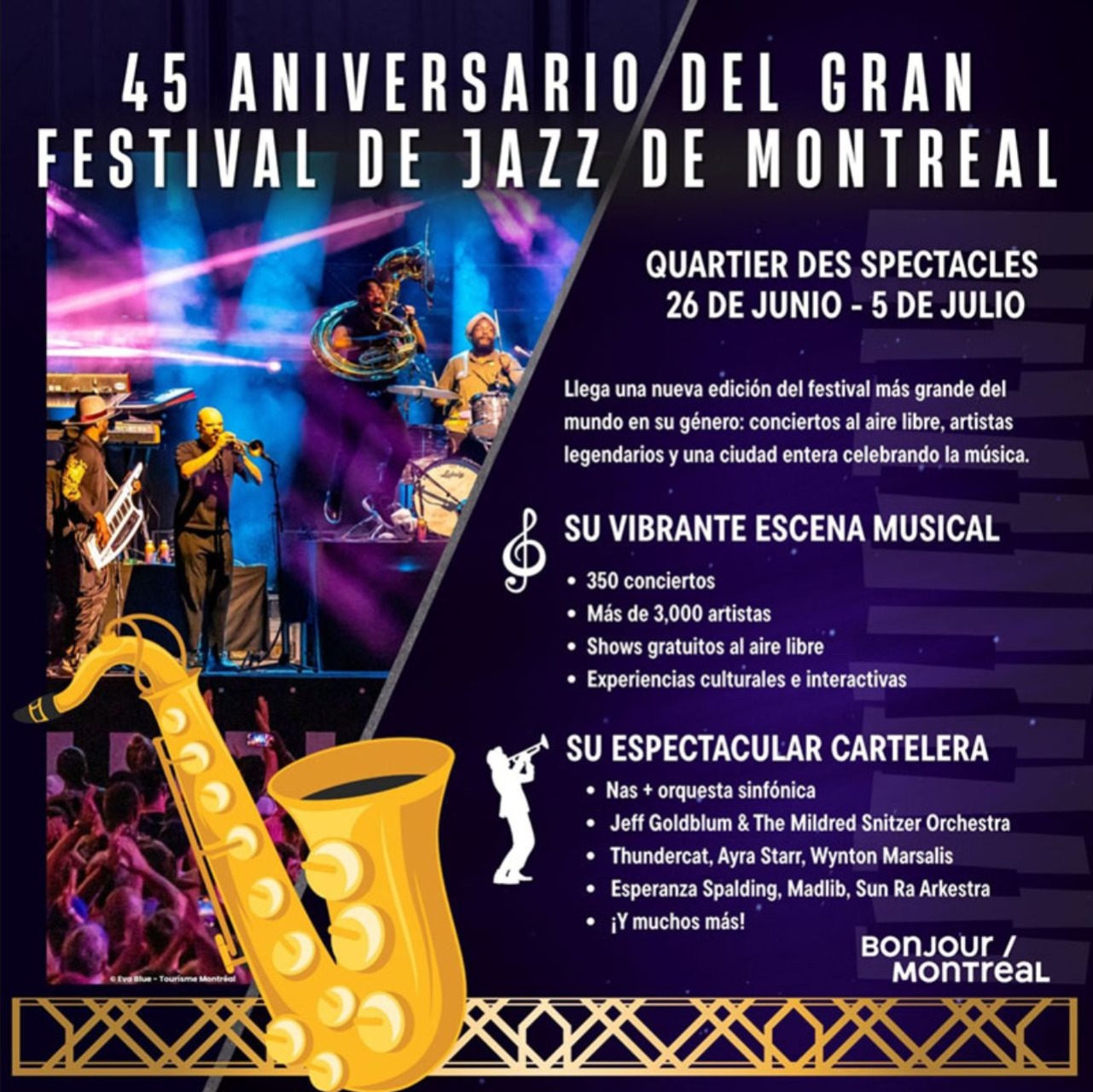 El Festival Internacional de Jazz de Montréal es más que un evento: es una celebración colectiva, un punto de encuentro para amantes de la música, y una plataforma para artistas de todo el mundo. Toda la programación, biografías de artistas, mapas y experiencias adicionales están disponibles en el sitio oficial: montrealjazzfest.com
