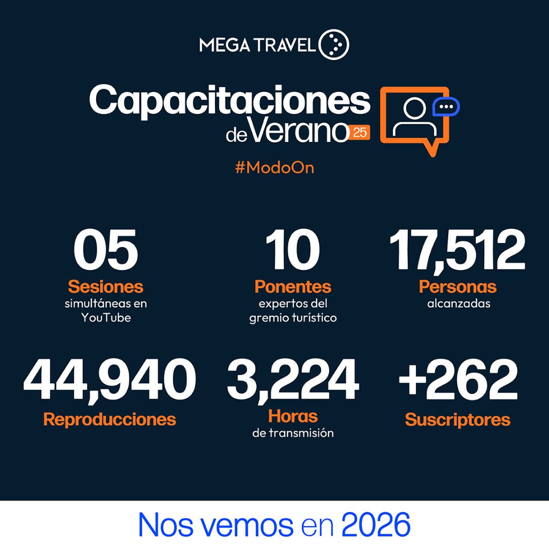 A través de cinco sesiones temáticas en vivo, Mega Travel ofreció contenido especializado en ventas, atención al cliente, producto, tecnología y marketing digital, con el objetivo de fortalecer las herramientas comerciales de las agencias de viajes y brindarles recursos actualizados para destacar en un mercado competitivo y hacer crecer su negocio.