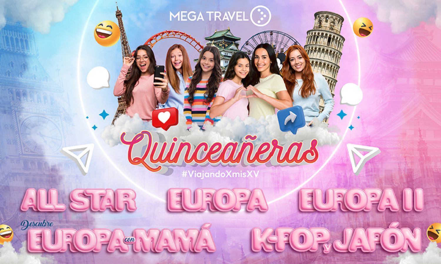 Los programas Quinceañeras 2026 incluyen opciones a Europa (con diferentes duraciones), Europa con mamá, K-POP y Japón, y el programa All Star en Orlando. Los viajes ya están disponibles para reserva a través de Vendor en Café Mega Travel. El cupo es limitado, por lo que se recomienda asegurar los lugares con anticipación.