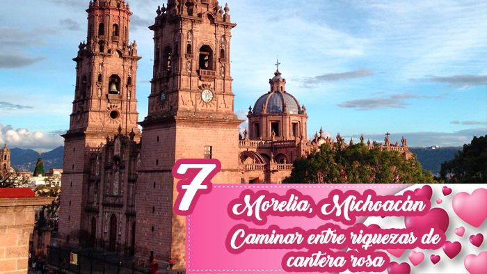 La ciudad de Morelia encantará a los enamorados con su gastronomía tradicional, sus dulces y artesanías, pero principalmente, con sus impresionantes construcciones de cantera rosa que pueden apreciarse en cada rincón. El Centro Histórico cuenta con más de 200 importantes edificios y 15 plazas. Son imperdibles la Catedral, el Palacio Clavijero, la Casa de las Artesanías y el estrecho Callejón del Romance, que cuenta con 19 inmuebles catalogados como monumentos históricos, jardineras y bancas para los novios.