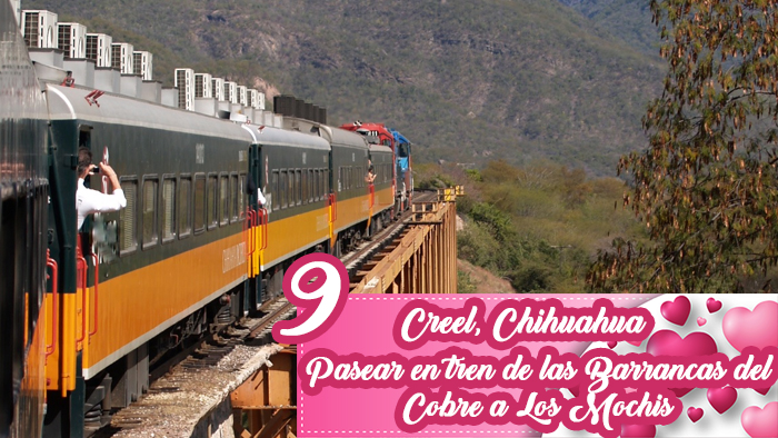Tomen el tren “El Chepe” desde la estación Creel en Chihuahua hasta Los Mochis, Sinaloa para contemplar sensacionales paisajes, probar ricos platillos mexicanos y coleccionar muchas fotografías. Desciendan en la estación Divisadero para admirarse con las Barrancas del Cobre y pasar una noche en alguno de sus encantadores hoteles, o en el pueblo de Creel, otro sitio en el que no les faltarán los escenarios románticos.