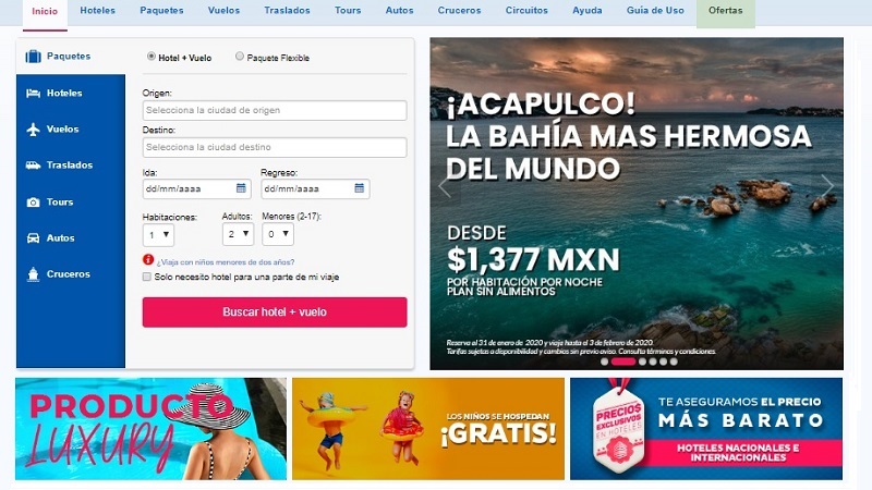 Su Portafolio de productos está integrado por hoteles tanto nacionales como internacionales, paquetes de viaje, boletos aéreos, tours, renta de autos, cruceros y circuitos.