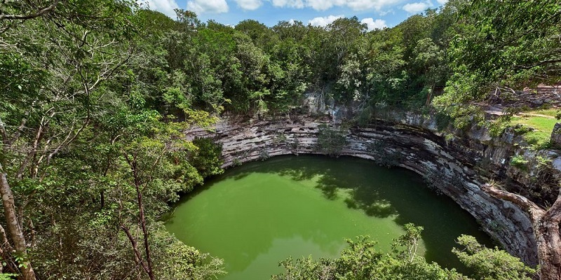 El Cenote Sagrado, ubicado en Chichen Itzá, mide 75 metros de diámetro y 35 de profundidad. Este sitio era el corazón de las actividades religiosas de toda la zona maya.