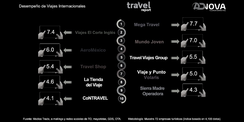 Así, vemos que en el índice desempeño de los viajes internacionales en México, siguen manteniendo una posición de liderazgo, considerando los 10 indicadores ponderados, los operadores de gran experiencia como Mega Travel, Viajes El Corte Inglés y Mundo Joven.
