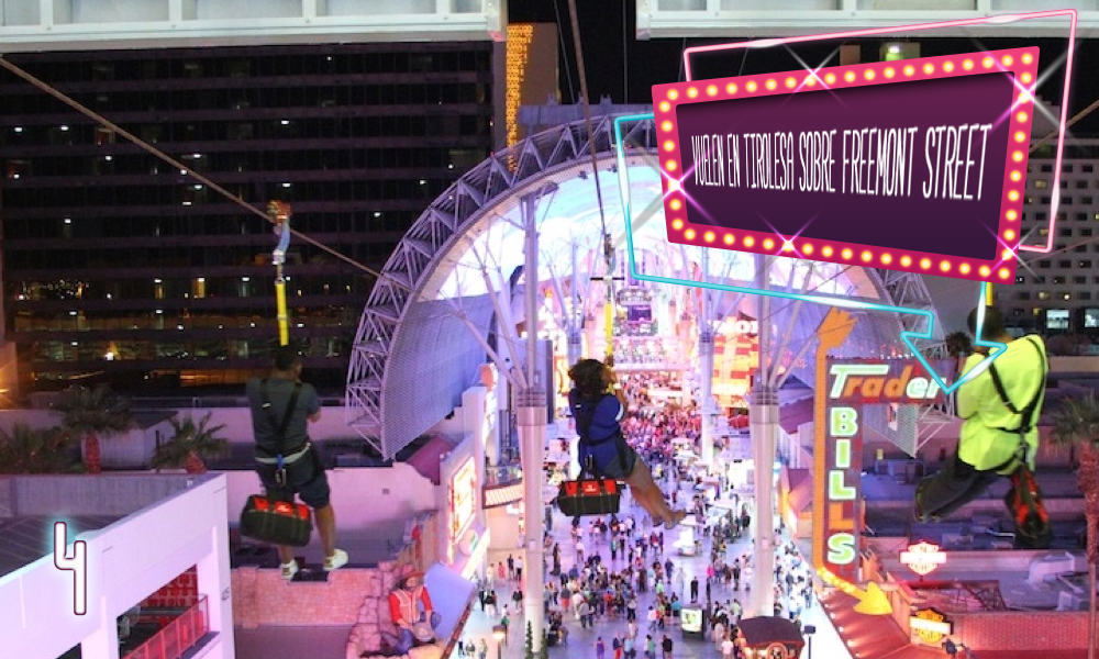 Esta es la experiencia perfecta para las parejas amantes de las emociones fuertes. Slotzilla es una imperdible atracción en Fremont Street. En esta atracción se encuentra una tirolesa inspirada en las máquinas traga monedas de Las Vegas que ofrece dos tipos de vuelo, la Zipline (25 dólares) a 23 metros de altura en la que los aventureros vuelan sentados y aterrizan a medio camino del paseo peatonal Fremont Street Experience, entre los casinos Four Queens y Fremont. Y la Zoomline (45 dólares), que despega a más de 34 metros en la que puedes lanzarte al estilo “Superman” recorriendo Fremont Street Experience y aterrizando en el casino más clásico de la ciudad, Golden Gate, alcanzando en ambos vuelos velocidades de hasta 64 km por hora.